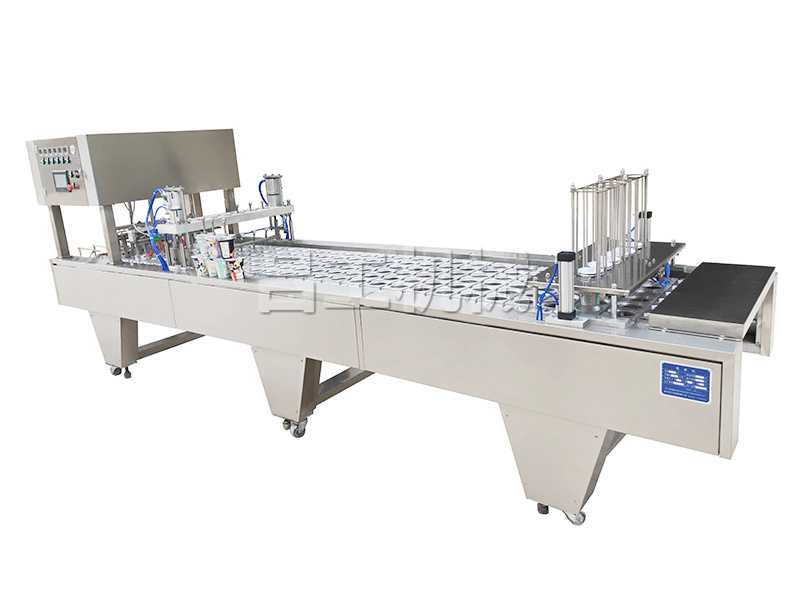 本机采用合理的机械传动,功能齐全,灌装、封口、切边、制品推出,废料收卷,印码等自动化工作,可节约人力,降低成本。本机有二次热封装置,料杯/碗/盒与封膜经过前后二次热封,封口牢固可靠。