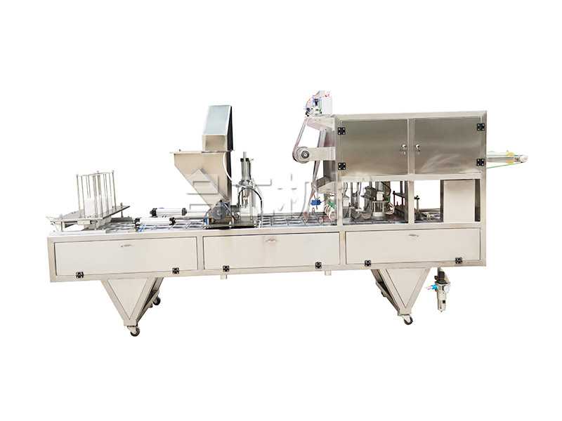 本机采用合理的机械传动,功能齐全,灌装、封口、切边、制品推出,废料收卷,印码等自动化工作,可节约人力,降低成本。本机有二次热封装置,料杯/碗/盒与封膜经过前后二次热封,封口牢固可靠。