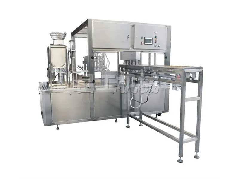 特点:本机从自动定位—自动吹气—自动定量两次灌装—自动清洗—自动下盖—自动旋盖—自动出袋