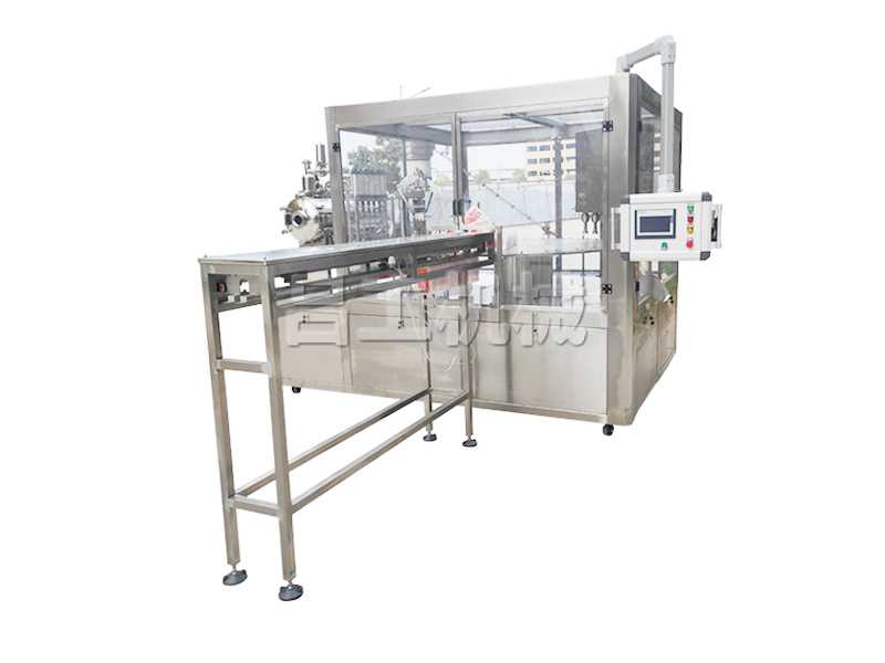特点:本机从自动定位—自动吹气—自动定量两次灌装—自动清洗—自动下盖—自动旋盖—自动出袋